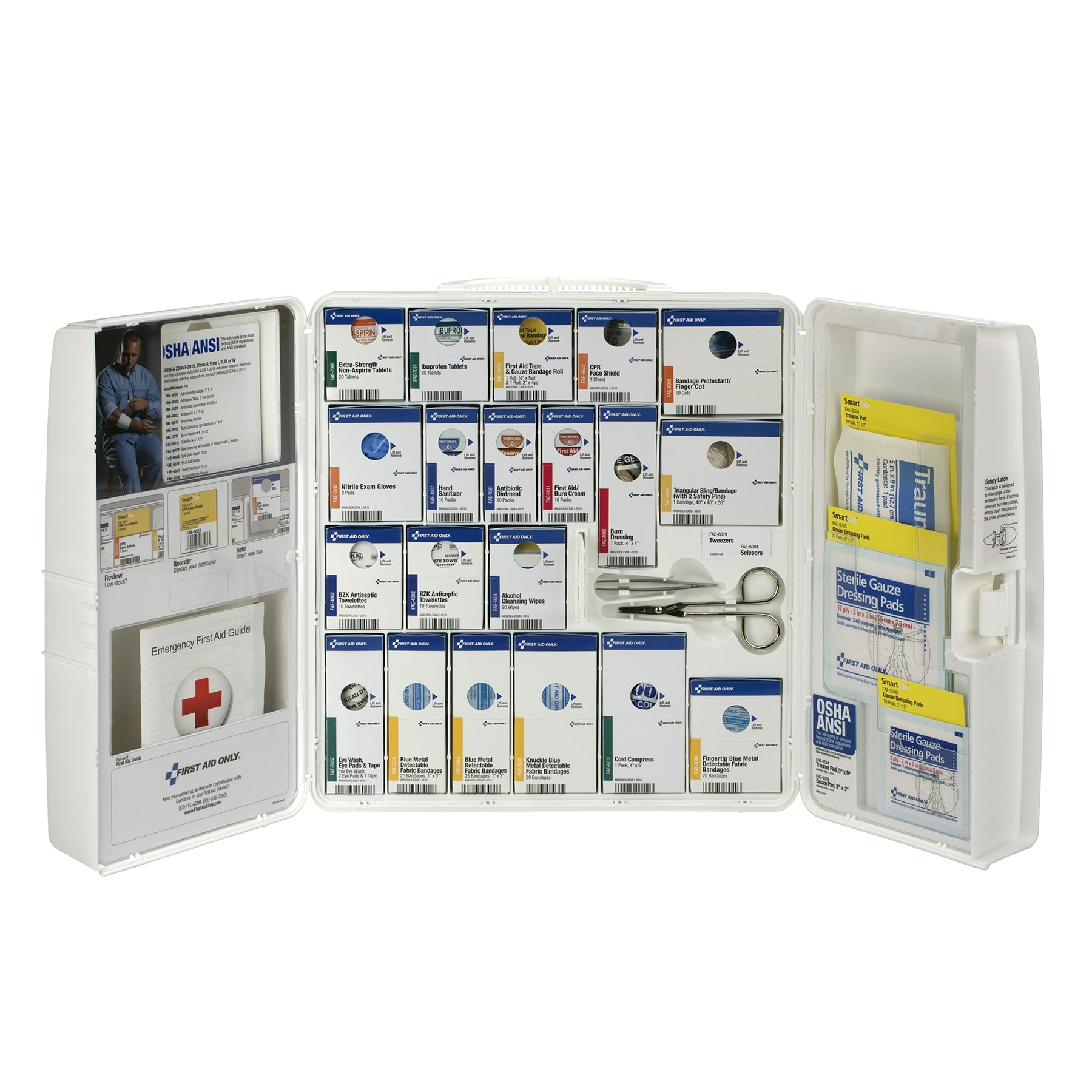 Durable and organized plastic case comes with a carrying handle and is wall mountable. Includes medications. Contents exceed the 2015 ANSI Class A requirements.