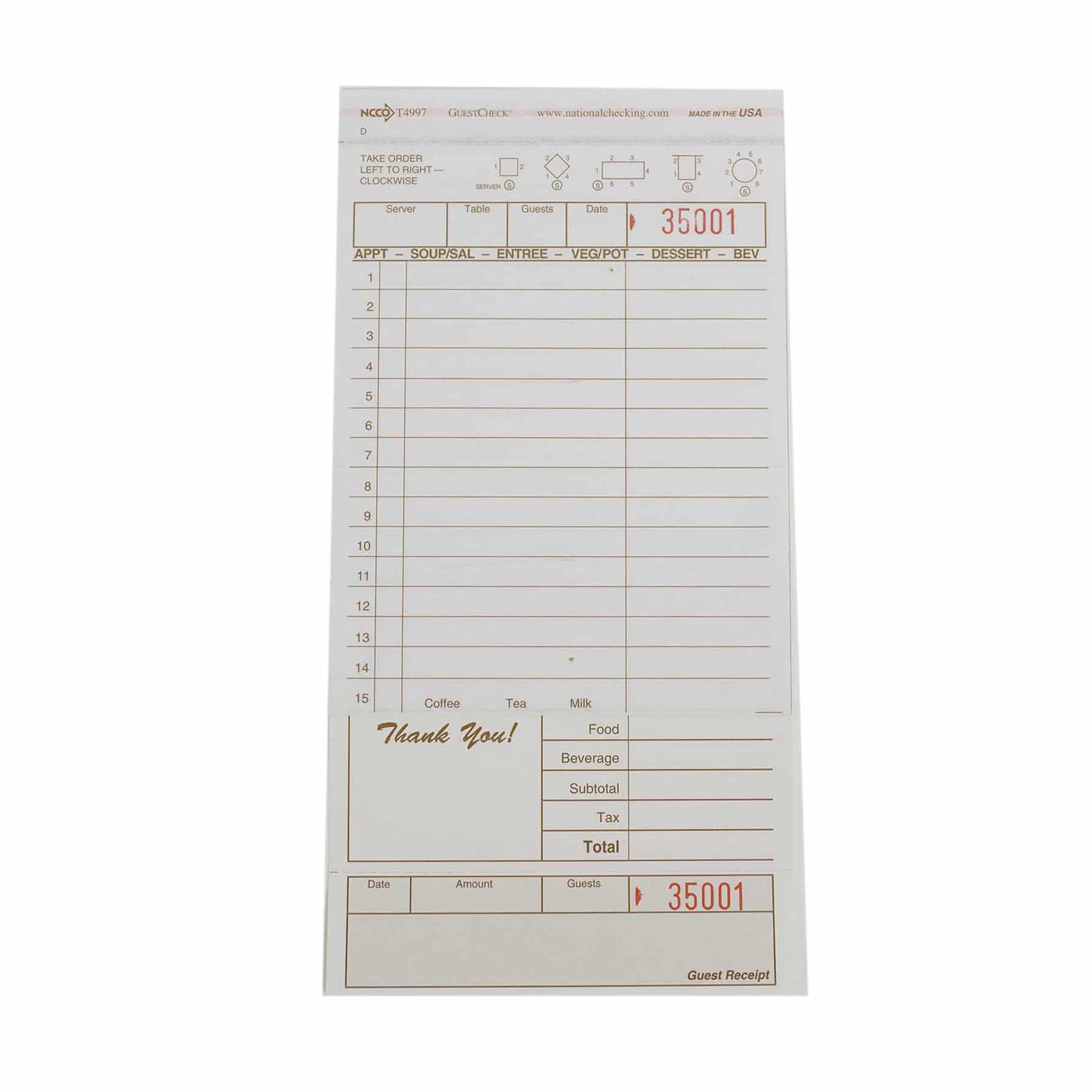 Large two-part carbonless guest checks feature a paper top copy and duplicate cardboard copy. The duplicate cardboard copy is created without needing a carbon insert.