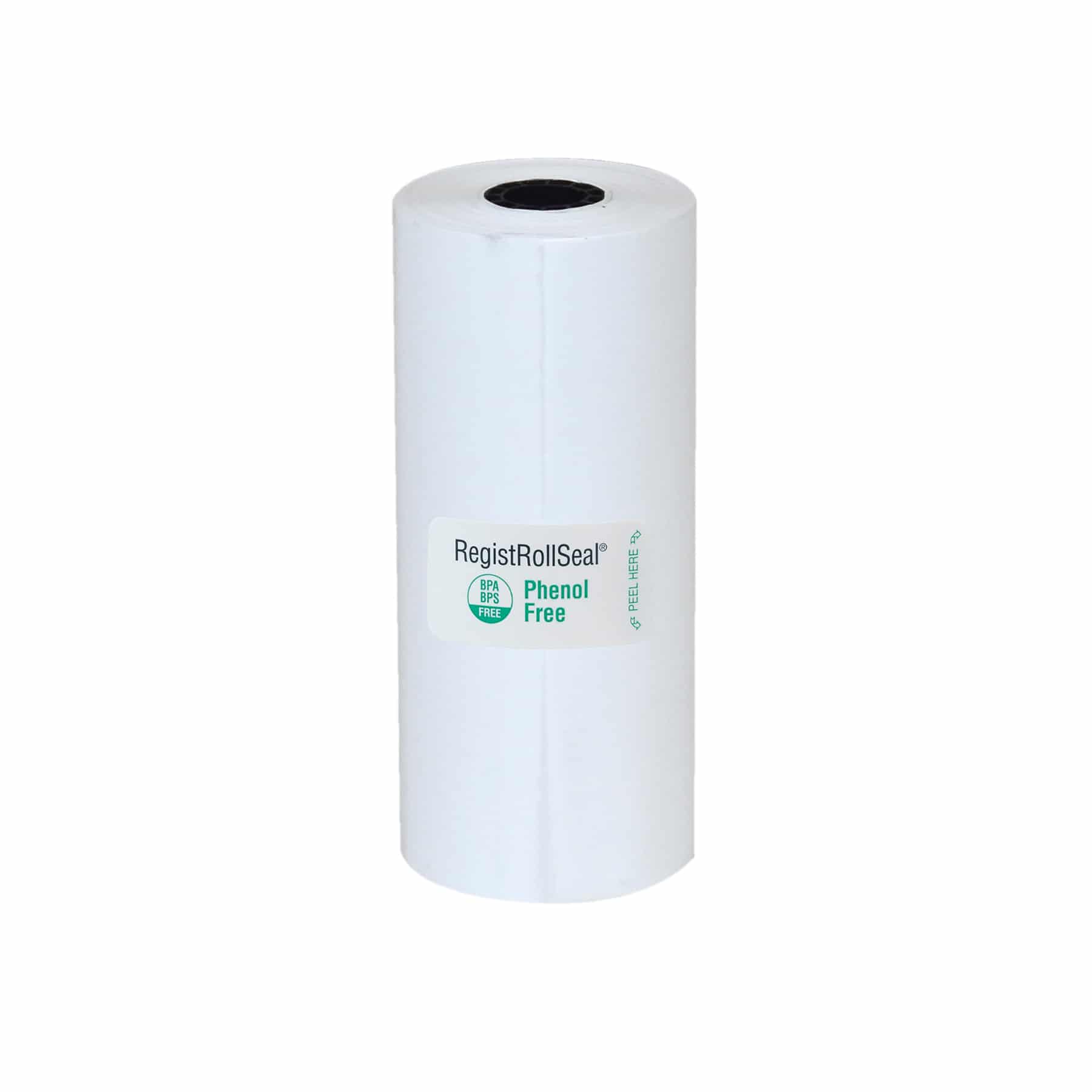 Thermal paper POS register rolls measuring 4.28″ wide and 100' long, conveniently packaged in shrink-wrapped trays.
